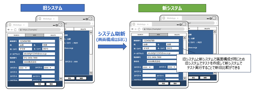 リホスト、リライト、リプレイスでは、現行システムと新システムでUI画面の構成が同じため、現新比較を自動化できます。