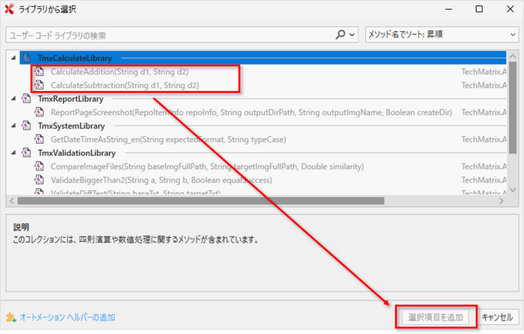 2)ライブラリから選択 画面にて、TmxReportLibrary – CalculateAdditionメソッド、またはCalculateSubtractionメソッド選択し、選択項目を追加 ボタンをクリックします。
