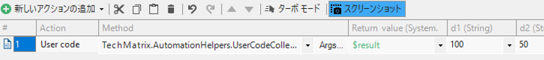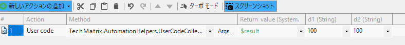 3)追加された User code アクションにて、選択したメソッドのパラメーターを設定します。