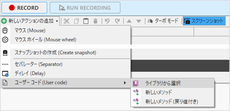 1)アクションテーブルの 新しいアクションの追加 から ユーザーコード(User code)- ライブラリから選択 を選択します。