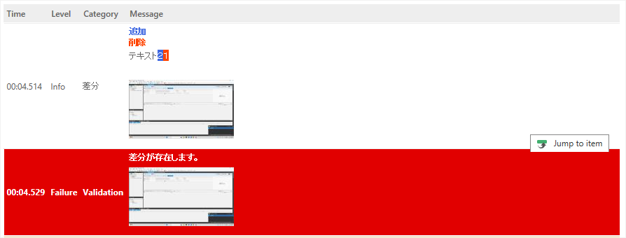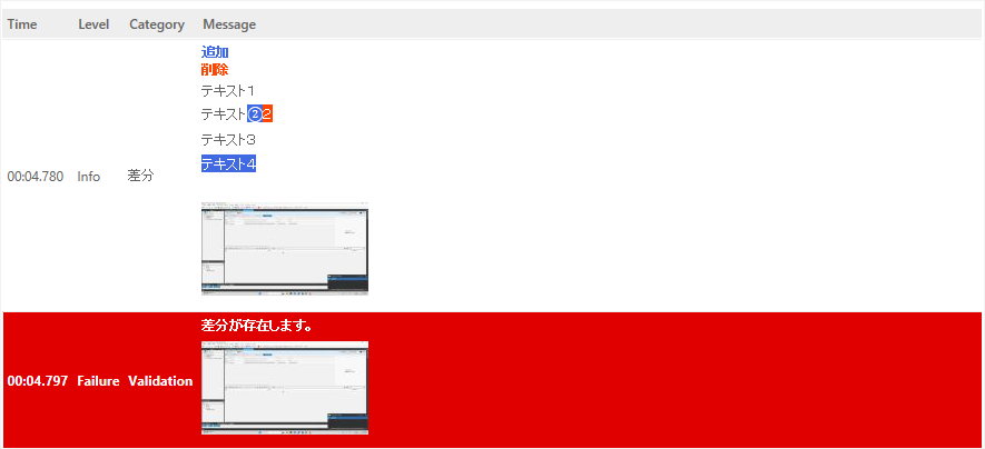 また、差分があった場合は、失敗として差分箇所(追加・削除)がレポートされます。