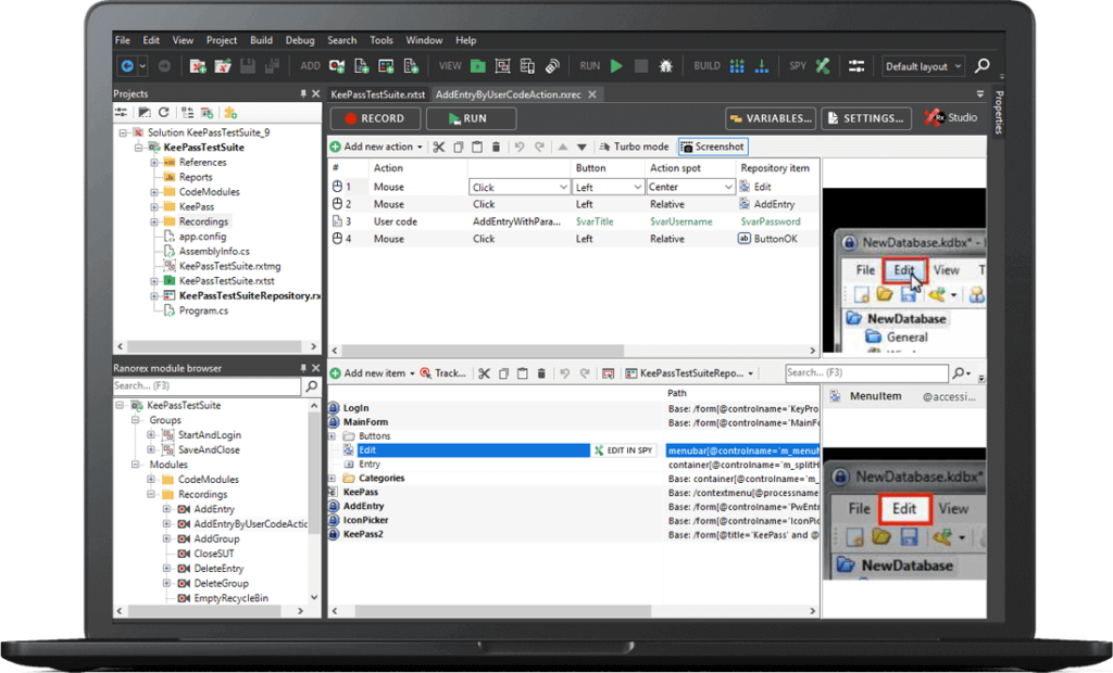テストを作成・編集するツールである Ranorex Studio と、テスト資産である Ranorex ソリューションは、Visual Studio の構成に準拠しているため、デスクトップアプリの開発に携わっている方に理解しやすい見た目になっています。プログラミング知識のない初心者から、ベテランの開発者まで幅広いユーザーが活用できるツールです。